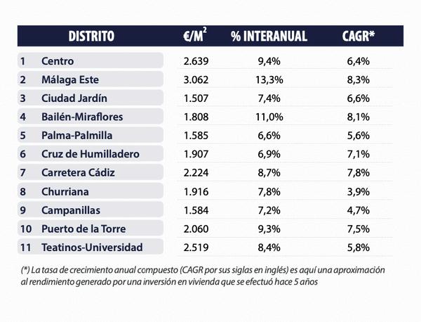 Enfin, la ville de Malaga accentue la tendance à la hausse Dans tous les quartiers, les prix ont augmenté de 6,6% à 13,3% par rapport à l'année précédente Les plus fortes augmentations de prix par rapport à l'année précédente se situent dans les districts de Este, Bailén-Miraflores, Centro et Puerto de la Torre, avec plus de 9% Au cours du trimestre actuel, Bailén-Miraflores et Teatinos-Universidad se distinguent Les prix les plus élevés se situent dans les quartiers de Este, Centro et Teatinos-Universidad, au-dessus de 2500€/m2