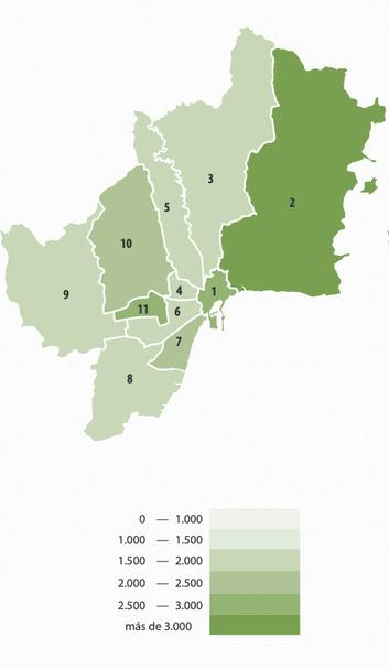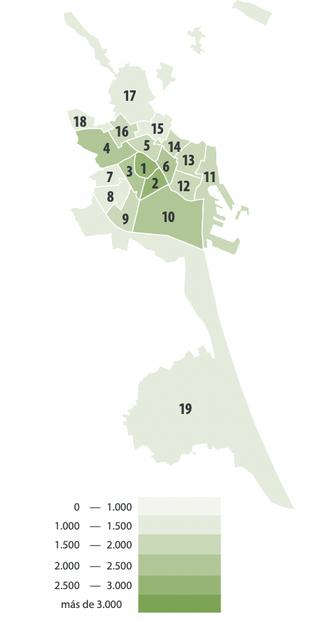 Les valeurs moyennes les plus élevées se trouvent dans les quartiers de Barrio de Salamanca et Chamberí, avec plus de 5400€/m2, suivis par Centro et Chamartín, avec 5000€/m2 À l'autre extrémité, les valeurs moyennes les plus basses se trouvent à Villaverde, Puente de Vallecas et Usera, avec moins de 2200€/m2