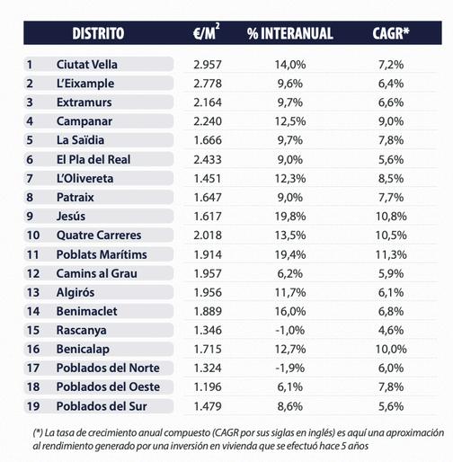 Valence intensifie la tendance à la hausse des trimestres précédents et des augmentations de prix supérieures à 8% et allant jusqu'à 19,8% sont observées dans 15 des 19 districts. Jesús et Poblats Marítims sont proches des 20% d'augmentation moyenne des prix au cours de l'année écoulée, avec les variations trimestrielles les plus fortes Jusqu'à 7 autres districts ont augmenté eurs prix entre 11 et 16%, parmi lesquels Ciutat Vella, Quatre Carreres et Benicalap Seuls Rascanya et Poblados del Norte sont exclus de ces fortes augmentations Les plus fortes augmentations trimestrielles se situent dans les districts de Poblats Marítims, Jesús et Poblados del Sur, dépassant les 6% En termes de valeur unitaire, Ciutat Vella, Eixample et El Pla del Real ont en tête de liste, au-dessus de 2400€/m2