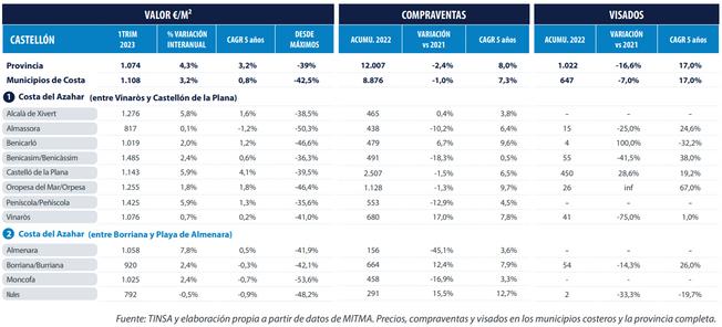Le marché des communes côtières a un poids relatif élevé, étant donné qu'il comprend la capitale, et concentre 69% des ventes et des achats et 50% du total des visas dans la province En 2022, il s'est aligné sur le dynamisme des ventes et des achats de l'ensemble de la province et sur celui des visas