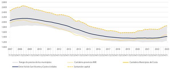 Le prix des maisons de vacances sur la côte se maintient et est conforme à la région Il s'élève en moyenne à 1.500 €/m2, contre une valeur moyenne globale des logements dans les communes côtières de Cantabrie de 1 425 €/m2 et une valeur moyenne pour l'ensemble de la province de 493 €/m2