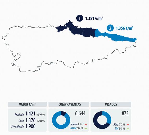 Le prix des maisons de vacances sur la côte n'augmente pas et est nettement plus élevé que le prix moyen Il est en moyenne de 2000 €/m2 entre Muros del Nalón et Villaviciosa et de 1500 €/m2 entre Colunga et Ribadedeva alors que la valeur moyenne globale des logements dans les communes côtières des Asturies est de 1376 €/m2 et que la valeur moyenne pour l'ensemble de a province est de 1421 €/m2