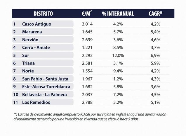 À Séville, des variations à la hausse sont enregistrées dans la plupart des districts - avec de fortes mpulsions au cours du trimestre actuel dans les districts de Cerro-Amate et de Norte. Les plus ortes augmentations par rapport à l'année précédente se trouvent dans le district Sur, où elles atteignent 12%, Norte et Cerro Amate, avec 9,4% et 8,5% Les valeurs unitaires les plus élevées se rouvent dans les districts de Casco Antiguo et Los Remedios, avec plus de 2.700€/m2.