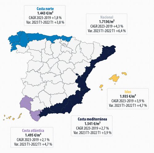 Les prix résidentiels dans les zones côtières continuent de refléter une décélération plus lente que la moyenne nationale ce trimestre, ce qui est cohérent avec l'existence d'une demande plus importante de résidences secondaires pour un usage propre de vacances, qui correspondent à un profil d'acheteur au pouvoir d'achat élevé et moins sensible à l'impact de l'inflation et des taux d'intérêt lors de leur décision d'achat