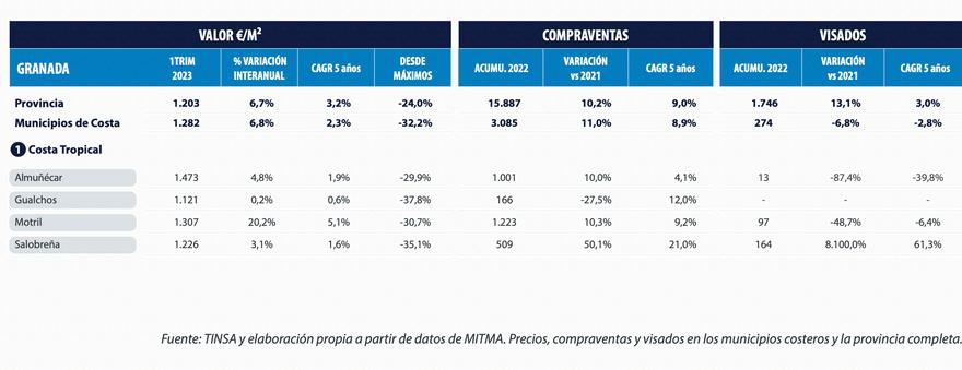 Le marché des communes côtières de la province de Grenade dans son ensemble a l'un des poids les plus limités en raison de la réduction du littoral. Il représente 19% des ventes et 16% du otal des approbations dans la province En 2022, elle a suivi le dynamisme des ventes et des achats de l'ensemble de la province, mais celui des visas
