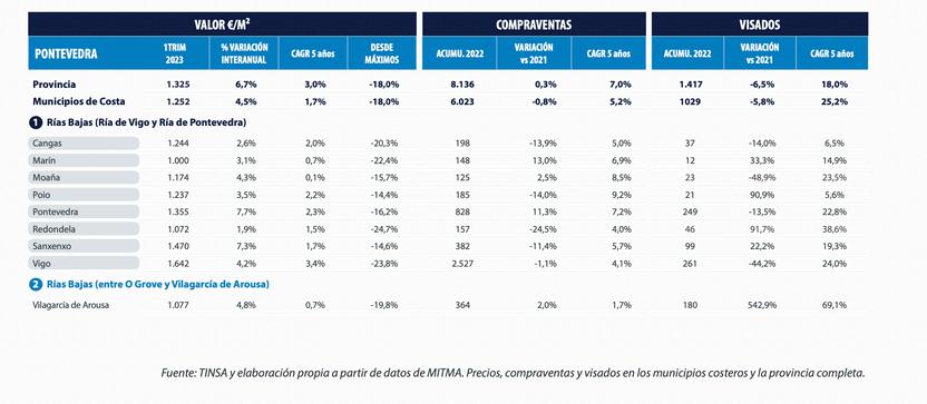 Le prix des maisons de vacances sur la côte se maintient et est nettement supérieur au prix moyen Il s'élève en moyenne à 1300 €/m2, contre une valeur moyenne globale des logements dans les communes côtières de Pontevedra de 1252 €/m2 et une valeur moyenne pour 'ensemble de la province de 1325 €/m2