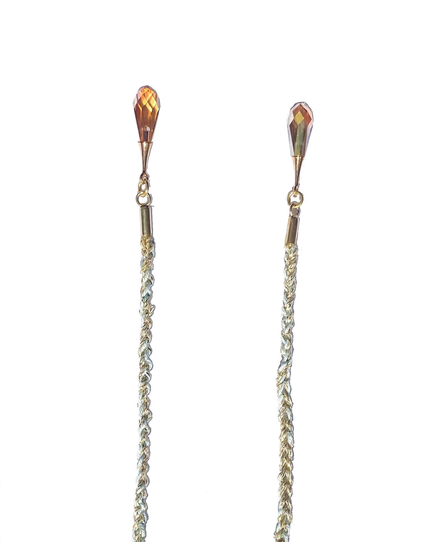 CHOKER PERLA y crochet. PENDIENTES LLUVIA en plata 925 y baño de oro de 18K, con cristal austriaco Swarovski. PULSERAS rígidas en latón y crochet.