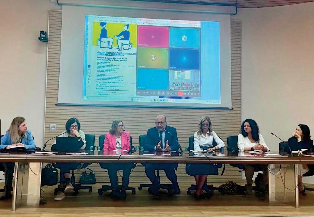 S ole ha s ottolineato: «Il contrasto alle politiche di genere in part i c o l a r e s u q u e s t o t e m a , v e d e l'Ateneo lavora da tempo su queste tematiche, noi abbiamo tante figure di garanzie, abbiamo la garante degli studenti, la consiglier a d i f i d u c i a , l o s p o r t e l l o d i r is c o n t r o p s i c o l o g i c o , o g g i a p r i am o a n c h e l o s p o r t e l l o d i p r i m o ascolto per contrastare la violenza di genere. È importante questa c o s a p e r c h é o r m a i è d i v e n t a t o quasi un problema strutturale nel nostro paese visto quello che accade quotidianamente Quindi noi v o g l i a m o p r e v e n i r e s o p r a t t u t t o parlando con le nostre studentesse ma con gli studenti in generale perché bisogna anche educare, con il personale dell'ateneo e anc h e i l p e r s o n a l e d e l C o m u n e d i Potenza che insieme a Telefono
