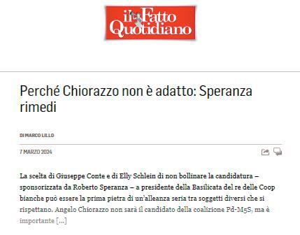 Con l’orgoglio di stare in un partito vero, popolare , plurale e democratico , il Pd, ho avuto un sussulto n e l l e g g e r e l ’ a r t i c o l o d i L i l l o pubblicato oggi sul Fatto Quotidiano Non può esserci nulla di politico e valoriale in considerazioni senza senso messe in campo s o l o p e r a t t a c c a r e C h i o r a z z o p r i m a e S p e r a n z a d o p o c o n motivazioni che dimostrano la p o c h e z z a e i l i m i t i p o l i t i c i e culturali di chi ha firmato l’articolo