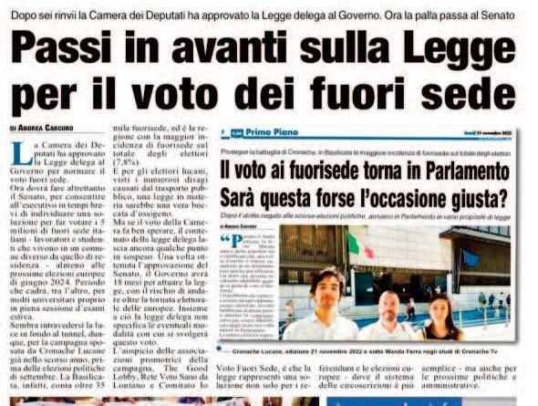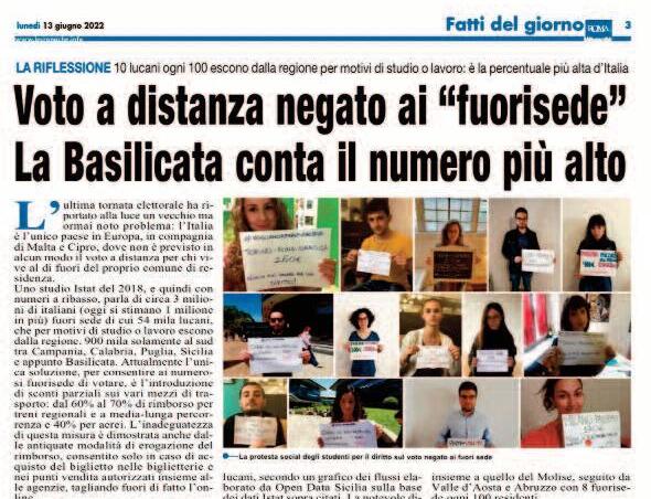 “Comitato Io Voto Fuoris e d e ” s i b a t t e d a d i v e r s i anni per sollecitare la politica sulla necessità di gar a n t i r e i l d i r i t t o d i v o t o fuorisede L’Italia è l’unic o p a e s e d e l l ’ U e a n o n prevederlo, fatta eccezione per Cipro e Malta che sono però territorialmente