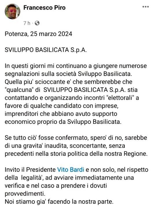 L’ a f f o n d o d i P i r o : « Q u a l c u n a u s a S v i l u p p o B a s i l i c a t a p e r f a r e c a m p a g n a e l e t t o r a l e »