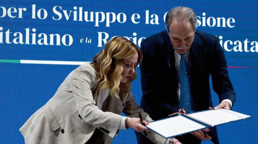 «È un accordo molto imp o r t a n t e - h a d i c h i a r a t o M e l o n i - Q u a n d o s i a m o arrivati al Governo ci siamo resi conto che una dis c r e t a p a r t e d e i f o n d i d i s v i l u p p o e c o e s i o n e n o n arrivava a terra C’era a disposizione 126 miliardi di e u r o , n e l 2 0 2 2 n e e r a n o s t a t e s p e s i c i r c a 4 7 F in a n z i a m o p r o g e t t i c h e vengono dalle regioni condivisi dal governo, lo facc i a m o p e r u n a s t r a t e g i a c o m p l e s s i v a d i s v i l u p p o d e l l a n a z i o n e N o n s i r i -