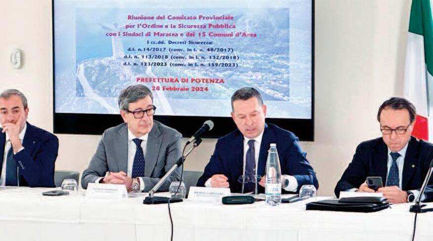 Si è s v o lta in lo calità Acquafredda di Maratea, nella prestigios a c o r n i c e d i V i l l a N i t t i , storico edificio appartenut o a F r a n c e s c o S a v e r i o Nitti, allora Presidente del C o n s i g l i o , i l P r e f e t t o d i P o t e n z a M i c h e l e C a m p an a r o h a p r e s i e d u t o l a s econda riunione del Comitato provinciale per l’ordine e la sicurezza pubblica, in sessione itinerante, convocata per analizzare l’andamento complessivo dell a d e l i t t u o s i t à n e l l ’ A r e a Sud-Ovest della provincia e pianificare nuove strategie congiunte, volte al raff o r z a m e n t o d e l p e r c o r s o d ’ a t t u a z i o n e d e l l a c o s i ddetta sicurezza urbana Presenti alla riunione, oltre i vertici provinciali dell e F o r z e d e l l ’ O r d i n e , i l C o m u n e C a p o l u o g o e l a P r o v i n c i a d i P o t e n z a , i S i n d a c i d e i C o m u n i d i Maratea, Calvera, Carbon e , C a s t e l l u c c i o S u p e r i or e , C a s t e l s a r a c e n o , E p iscopia, Lagonegro, Latronico, Lauria, Nemoli, Rivello, Rotonda, San Chiric o R a p a r o , S a n M a r t i n o d ’ A g r i , T r e c c h i n a e d i l C o m m i s s a r i o S t r a o r d i n ario del Comune di Castelluccio Inferiore I n t r o d o t t a d a i s a l u t i d e l S i n d a c o d i M a r a t e a D anieleStoppelli, la riunione è p r o s e g u i t a c o n l a r e l azione del Prefetto Campanaro, che ha animato i lav o r i d e l T a v o l o r i p e r c o rr e n d o l e t a p p e e v o l u t i v e d e l c o n c e t t o d i s i c u r e z z a urbana fino ad arrivare all e n o v i t à i n t e r v e n u t e n e l 2023 con il cosiddetto “decreto Caivano”,che ha ulteriormenteconsolidato gli s t r u m e n t i o p e r a t i v i d i t ut e l a , a t t r a v e r s o l ’ a m p l i am e n t o d e i p o t e r i d i o r d inanza del sindaco per esi-