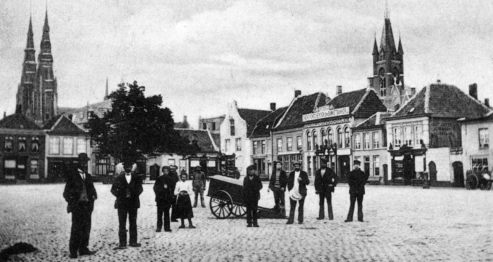 Op de achtergrond links de St.-Catharinakerk en rechts het torentje van het in 1967 afgebroken stadhuis.