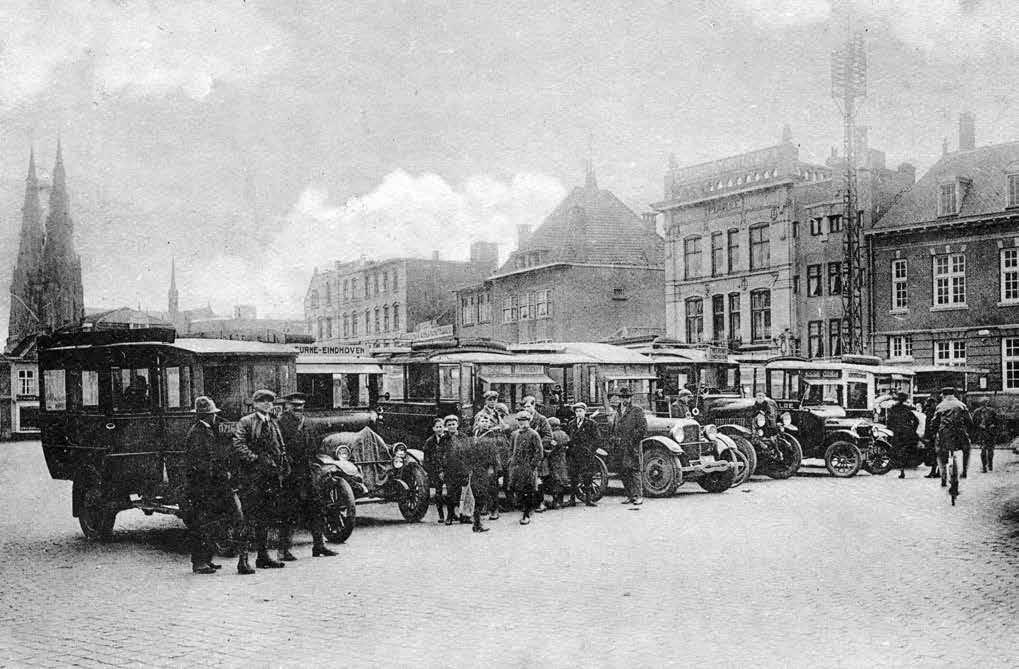 Jarenlang was de Markt de spil waar de stadbusdienst om draaide. De foto stamt uit de begintijd, eind jaren twintig van de vorige eeuw.