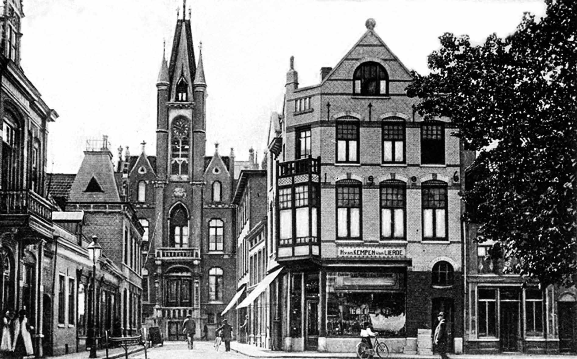 Deze foto uit 1917 geeft een beeld van de Jan Hooffstraat en het oude stadhuis aan de Rechtestraat. Dat werd gesloopt net als het uit 1906 stammende bijzondere pand rechts dat op de hoek van de Markt stond.