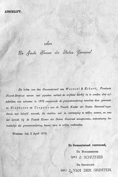 De gemeente Woensel schrijft in 1874 bijgaande brief in een laatste poging de grenswijziging tegen te houden. Negen jaar lang sleept deze tragikomedie zich voort met hoofdrolspelers die overlopen naar het kamp van de tegenpartij.