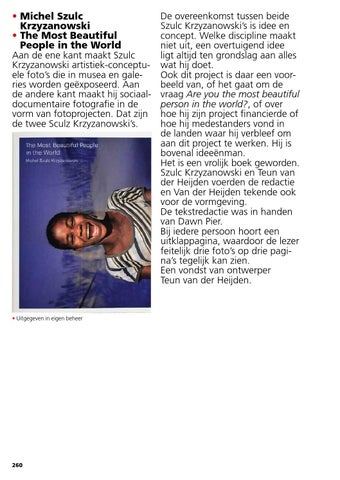 • Michel Szulc • Krzyzanowski • The Most Beautiful • People in the World Aan de ene kant maakt Szulc Krzyzanowski artistiek-conceptuele foto’s die in musea en galeries worden geëxposeerd. Aan de andere kant maakt hij sociaaldocumentaire fotografie in de vorm van fotoprojecten. Dat zijn de twee Sculz Krzyzanowski’s.