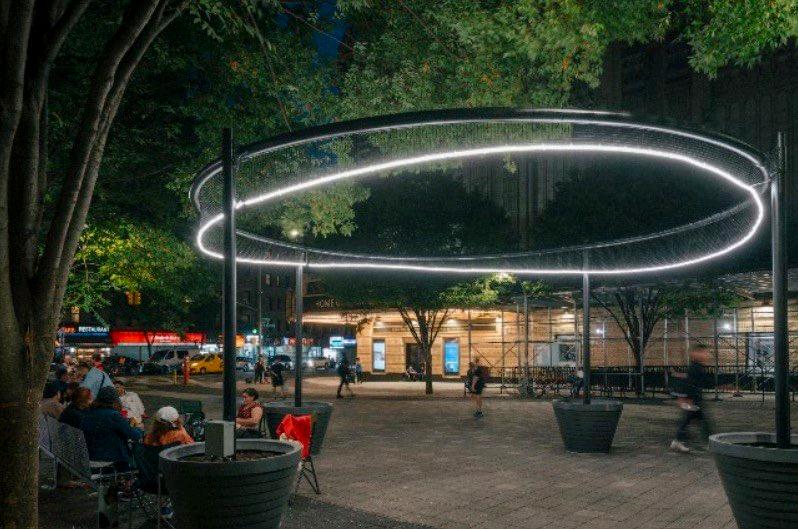 Thissite-specificinstallationisinspiredby communalcelebrationinthepublicsquare,a culturaltraditiondeeplyembeddedinthe neighborhood’sLatinAmericandiaspora.Soft illuminationfromundulatingcirclestransforms twopublicspaces,creatinganinvitingspace forinteractionwhileincreasingnighttime visibility.Jurycomment:Thisisafun,joyful installationthatdefinesthespacethrough light.