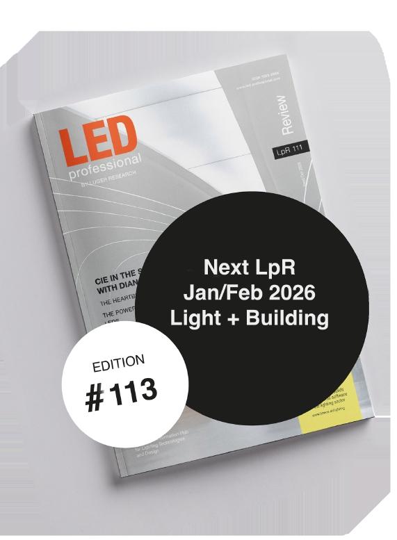 I’mverypleasedtopresentthenewissueofLEDprofessionalReview (LpR),Nov/Dec2025.Asyoumayhavenoticed,ourmagazinehas evolvedfromapurelytechnology-focusedpublicationintoanapplicationanddesign-orientedreview.Thistransformationisalsoreflectedinthe currentissue,whereweonceagaincoverawiderangeoftopics—from stadiumlighting,smartcities,andhealth-relatedlightingapplicationsto nanotechnology,measurementtechniques,andGaNcontroller developments.