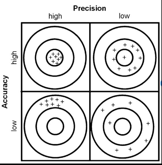 Simplifying, precision ishowfarweget repeatedreadingsfromaninstrument,and accuracy ishowclosethereadingisfrom the“truevalue”.Thiscanbeseengraphicallyinthefigurebelowthatillustratesthe differencebetweenaccuracyandprecision, with“truevalue”beingthecenterofthe target.
