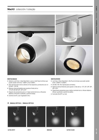 ཛྷ Ópticas intercambiáveis para ajustar o halo de luz: 15º, 20º, 28º, 30º, 40º e 55º. ཛྷ Disponíveis acessórios para melhor controle da luz: difusor elíptico, difusor quadrado e painel de abelha. ཛྷ Controle ON/OFF ou Dali.