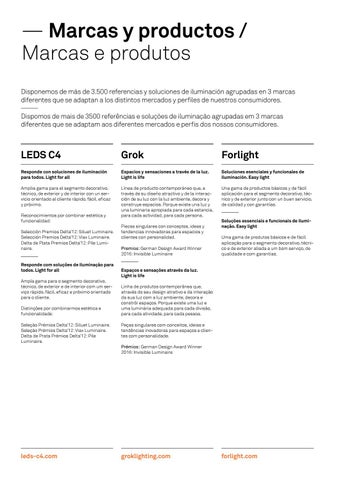 — Marcas y productos / Marcas e produtos Disponemos de más de 3.500 referencias y soluciones de iluminación agrupadas en 3 marcas diferentes que se adaptan a los distintos mercados y perfiles de nuestros consumidores. Dispomos de mais de 3500 referências e soluções de iluminação agrupadas em 3 marcas diferentes que se adaptam aos diferentes mercados e perfis dos nossos consumidores.