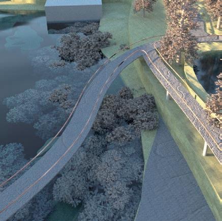 To enhance the accessibility to the waterfront Within this stepped landscape, from high to low, the levels are as follows: 1. Water retention wetland 2. Agriculture 3. Vegetation restoration and elevated walkway 4. Riverside playground 5. the Bridge as a secondary embankment. By doing so, the flood defences that separated the city become infrastructure enabling residents to wander and explore.