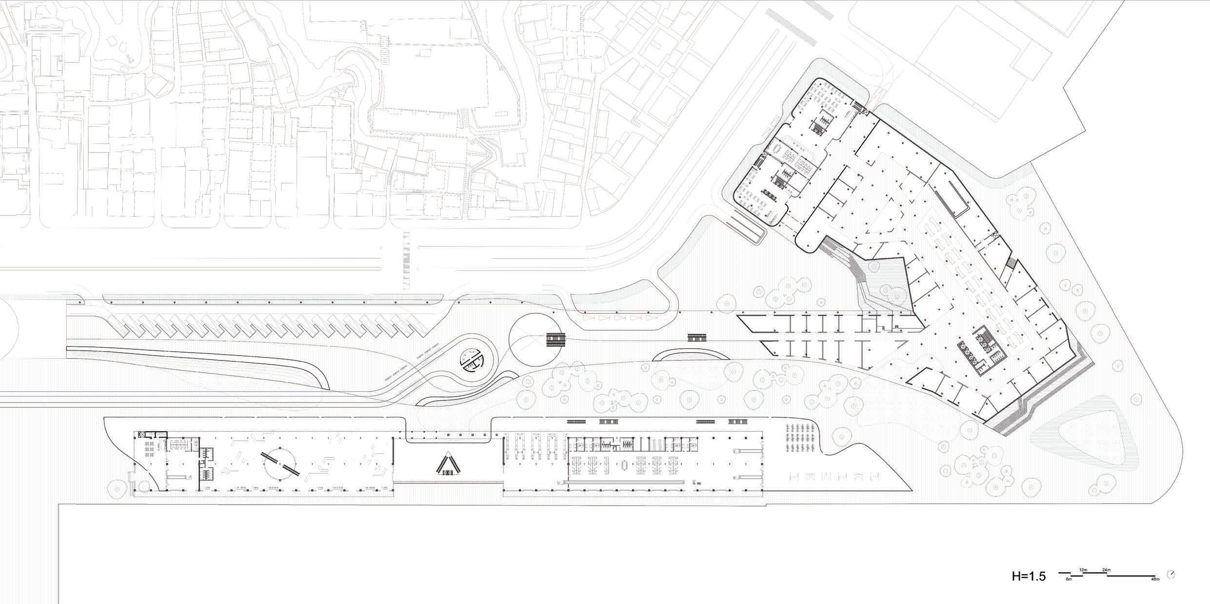 There are four hierarchies of A' in this picture. First of all, passengers on the light rail can feel the hint of arrival through the sunlight after unearthed. Secondly, passengers can read the detailed structure behind the glass while walking between the landscape and the old warehouse.