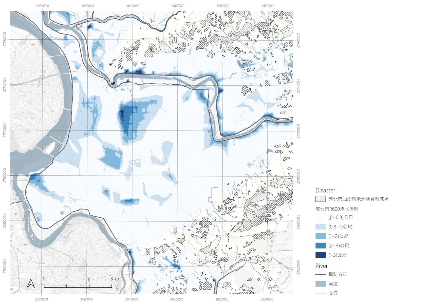 Currently, the riverside areas of Taipei City are surrounded by protective structures, with a standard flood defence height of 9 meters, designed to withstand a 200-year recurrence period flood. While these defences protect Taipei City from flooding, they also create a physical separation between people and the rivers. This design proposal aims to transform the barriers along the Tamsui River into a landscaped area that can be used for various human activities. Different intensities of human engagement are incorporated into the various landscape elevations, encouraging urban residents to interact with and enjoy the waterfront.