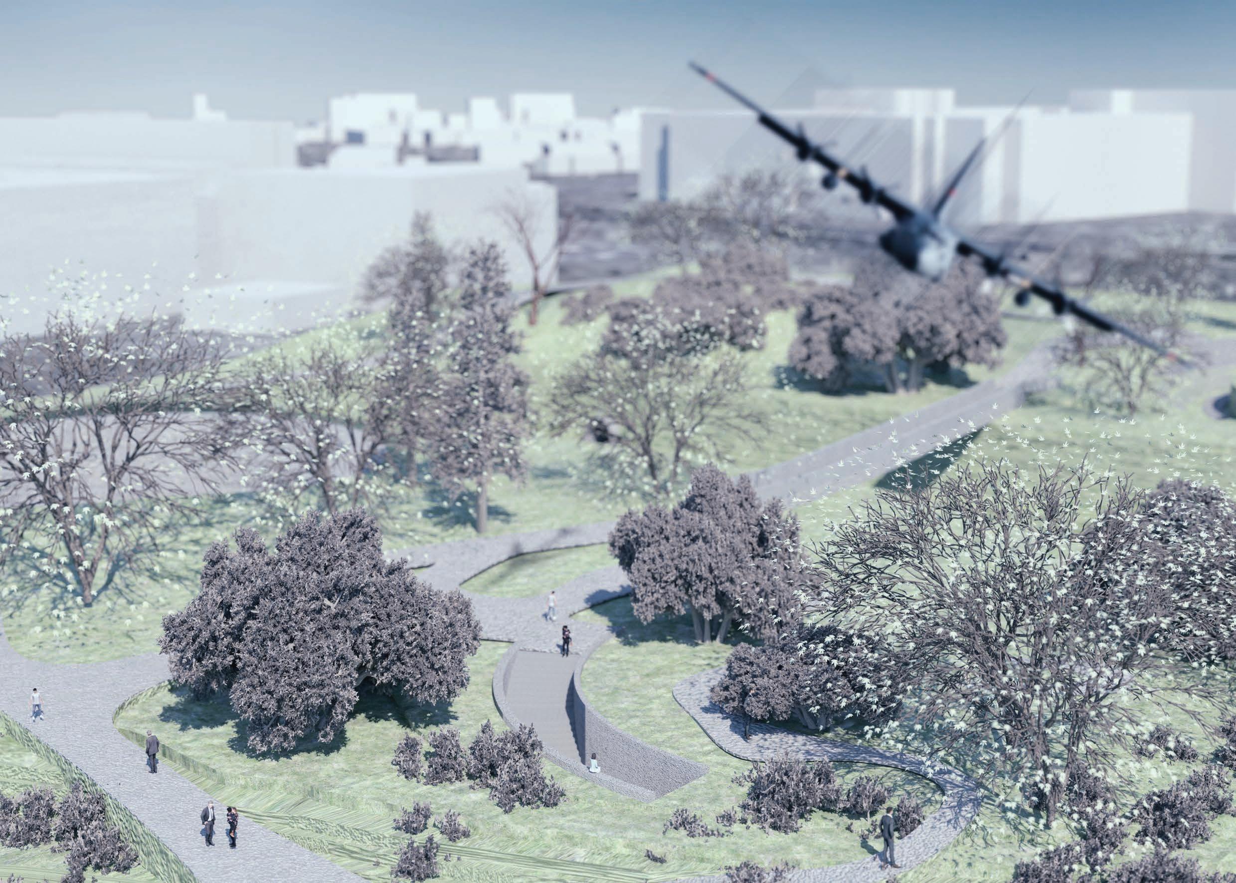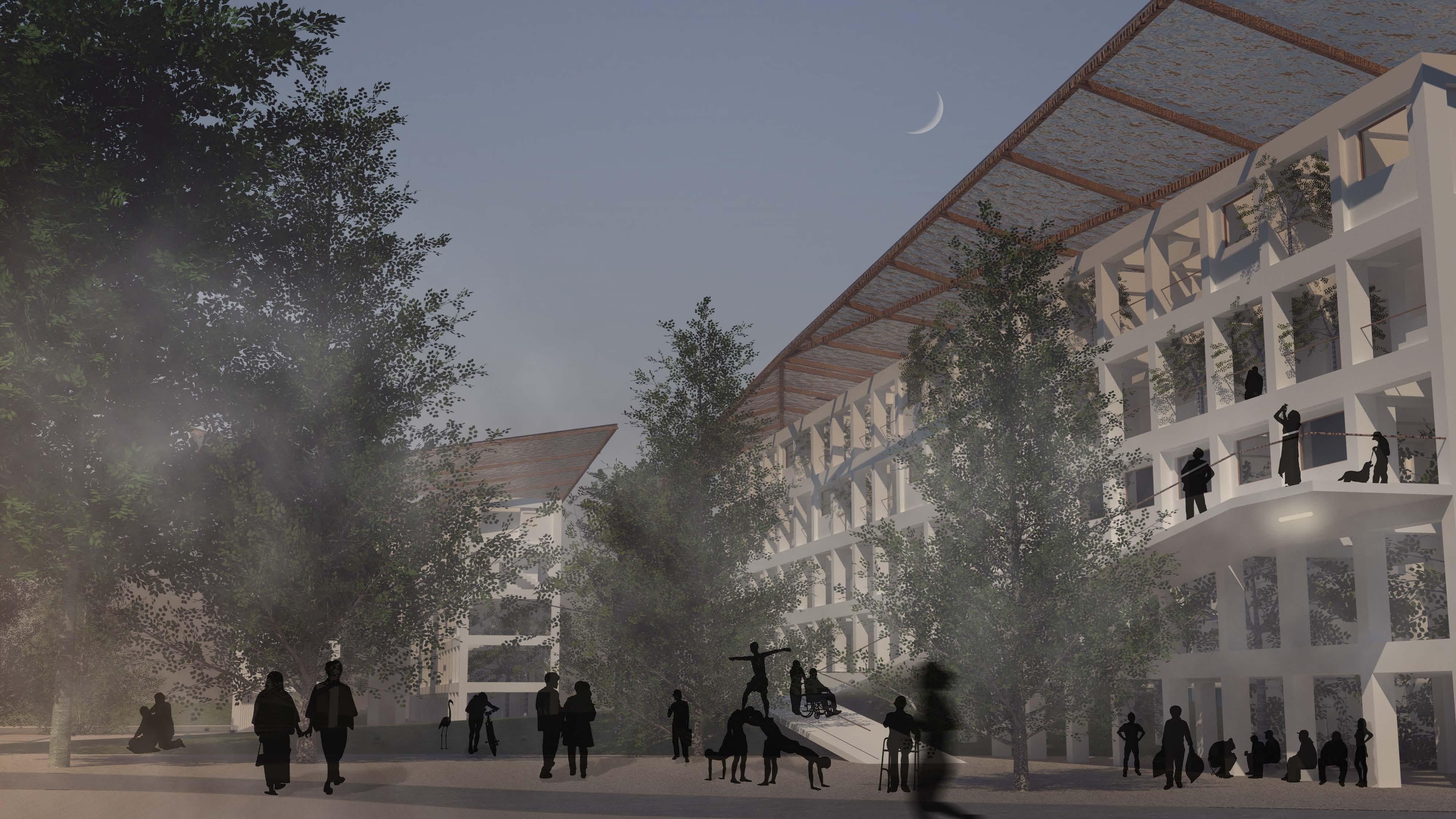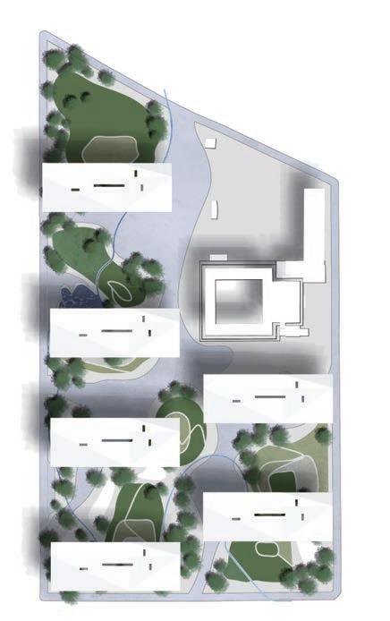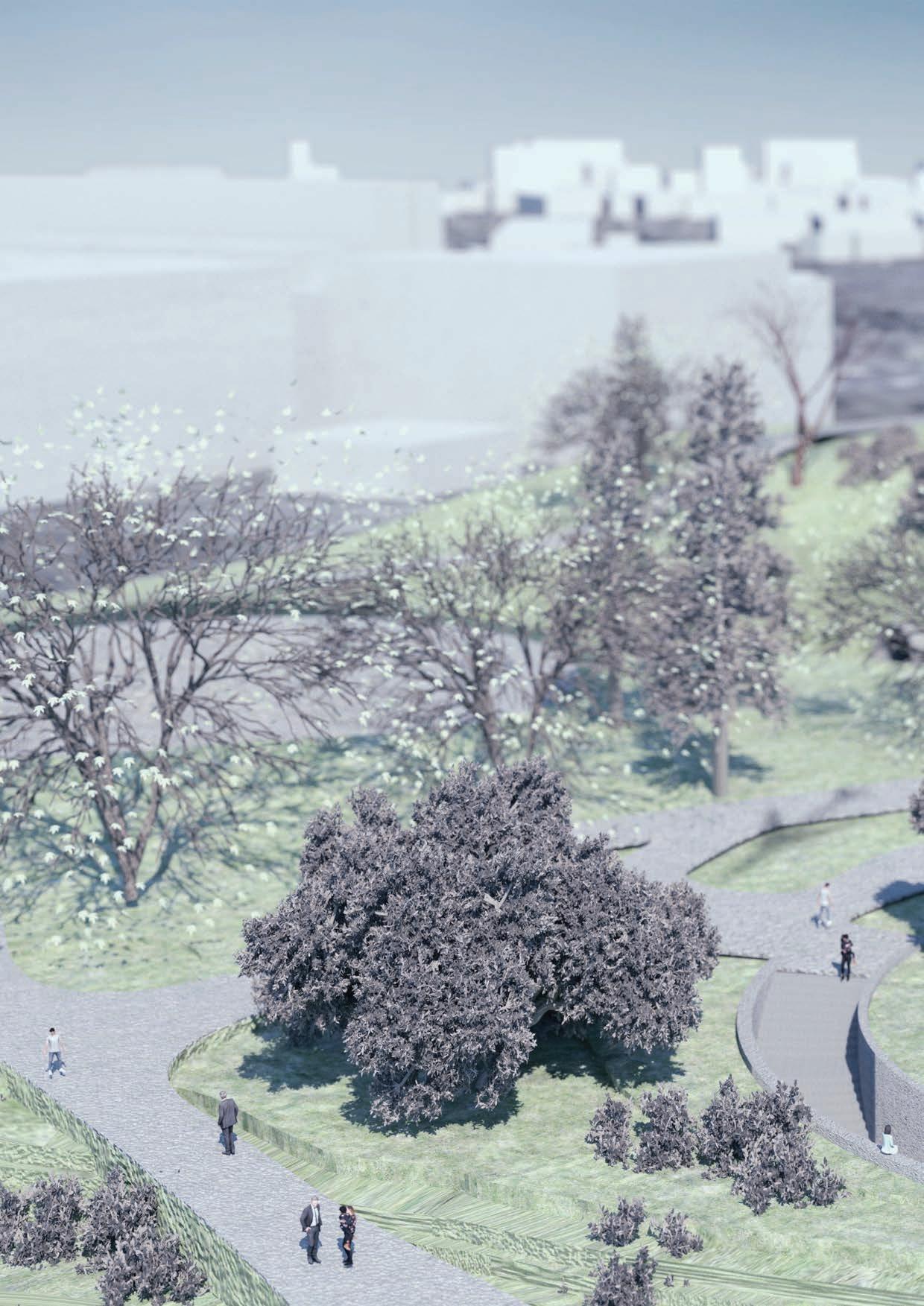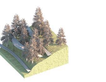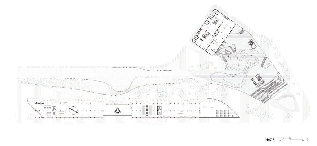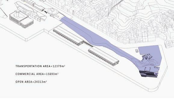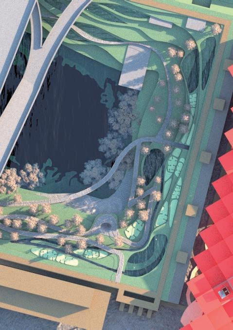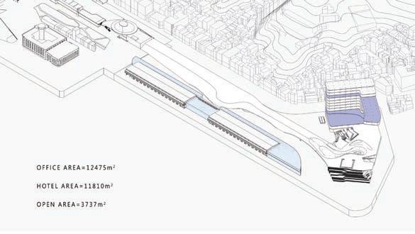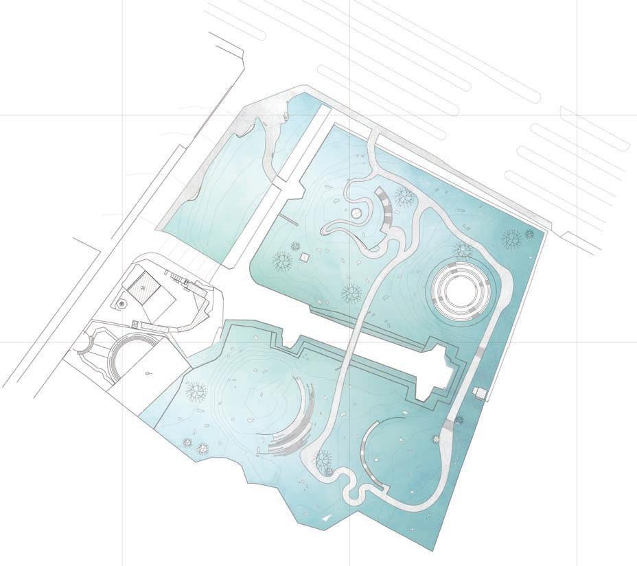 Then a semi-shaded space for sports and entertainment is under the distant two masses. Finally, the grassy slope above the landscape completes the last piece of the puzzle of the wandering path, bringing the passengers back to the north exit of the railway station.