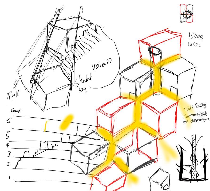 The 5th storey has more theoretical spaces such as classrooms, storage and the lecture hall. The classrooms are placed in a way so that the students are able to look through the void spaces into the different practical and social spaces.