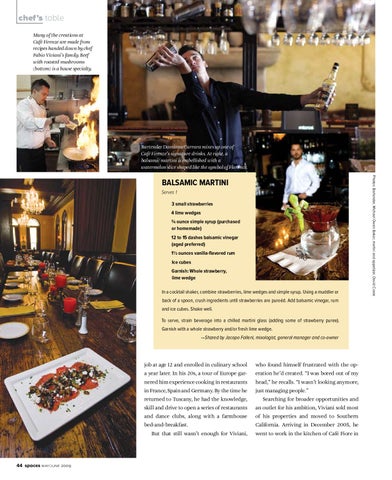 Serves 1 3 small strawberries 4 lime wedges ¾ ounce simple syrup (purchased or homemade) 12 to 15 dashes balsamic vinegar (aged preferred) 1½ ounces vanilla-flavored rum Ice cubes Garnish: Whole strawberry, lime wedge In a cocktail shaker, combine strawberries, lime wedges and simple syrup. Using a muddler or back of a spoon, crush ingredients until strawberries are pureéd. Add balsamic vinegar, rum and ice cubes. Shake well. To serve, strain beverage into a chilled martini glass (adding some of strawberry puree). Garnish with a whole strawberry and/or fresh lime wedge. —Shared by Jacopo Falleni, mixologist, general manager and co-owner