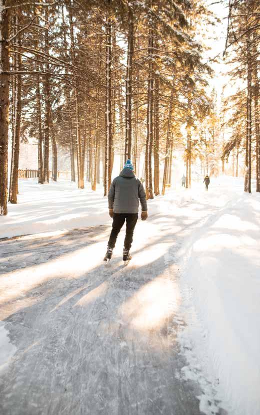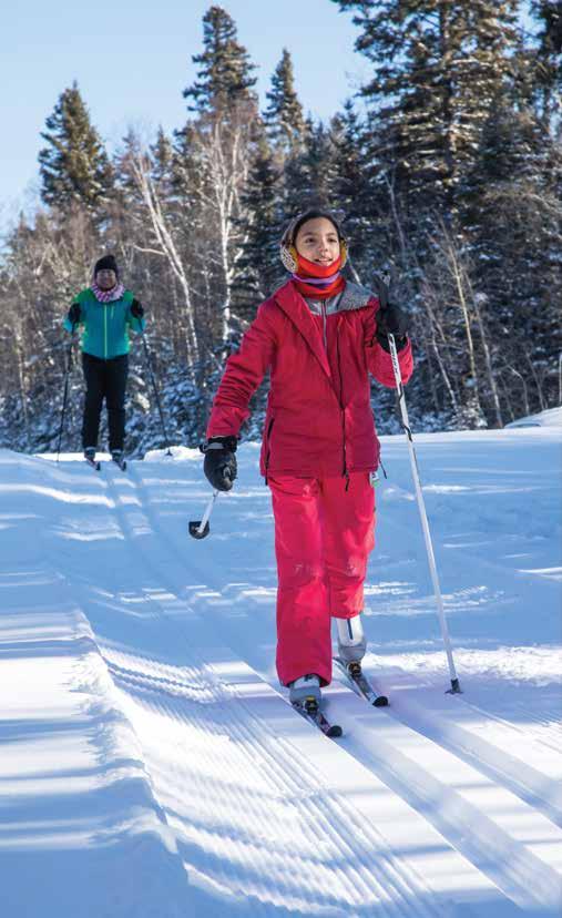 Groomed trails of varying levels of difficulty exist throughout RIDING MOUNTAIN NATIONAL PARK. For advanced skiers, the 8.4-km COMPOUND SKI TRAIL is a ski track set and groomed for classic corss-country skiing only. Accessed best from the Lake Katherine Day Use Area, ski this loop counterclockwise for a nordic delight, Ups, downs and tight turns take you through the forests between Clear Lake and Lake Katherine. The moderate-rated GREY OWL SKI TRAIL (14.8-km return) is also track set and groomed for classic cross-country skiing. Ski your way through the boreal forest while admiring the deep green of the spruces and the sparkling white snow. Spot a grouse or a fox hunting in the snow banks before you arrive at Grey Owl’s Cabin, a welcoming space to shelter. Finally, the BROADLEAF SKI TRAIL is a winding loop that climbs through poplar forests. Enjoy charming views atop the ridge. As you make your way clockwise, the trail connects to Beach Ridges Trail at about the 2.1-km point. Visit the RMNP website for more trail options and conditions. parkscanada.gc.ca/riding