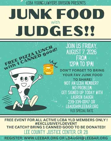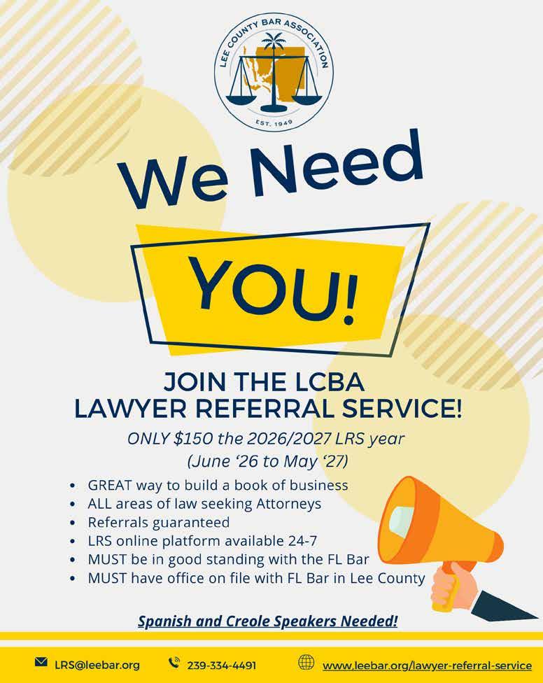 The Lee County Bar Association (LCBA) is off to a great start in 2026. In January, we held our annual Swearing-In Ceremony, during which the boards of directors for the LCBA, Young Lawyers Division (YLD), and Foundation were officially sworn in. We were thrilled with the excellent turnout, and the event was especially meaningful for me and my family – one I will remember forever. It is truly an honor to serve as president of the LCBA, and I am excited for all that lies ahead this year.