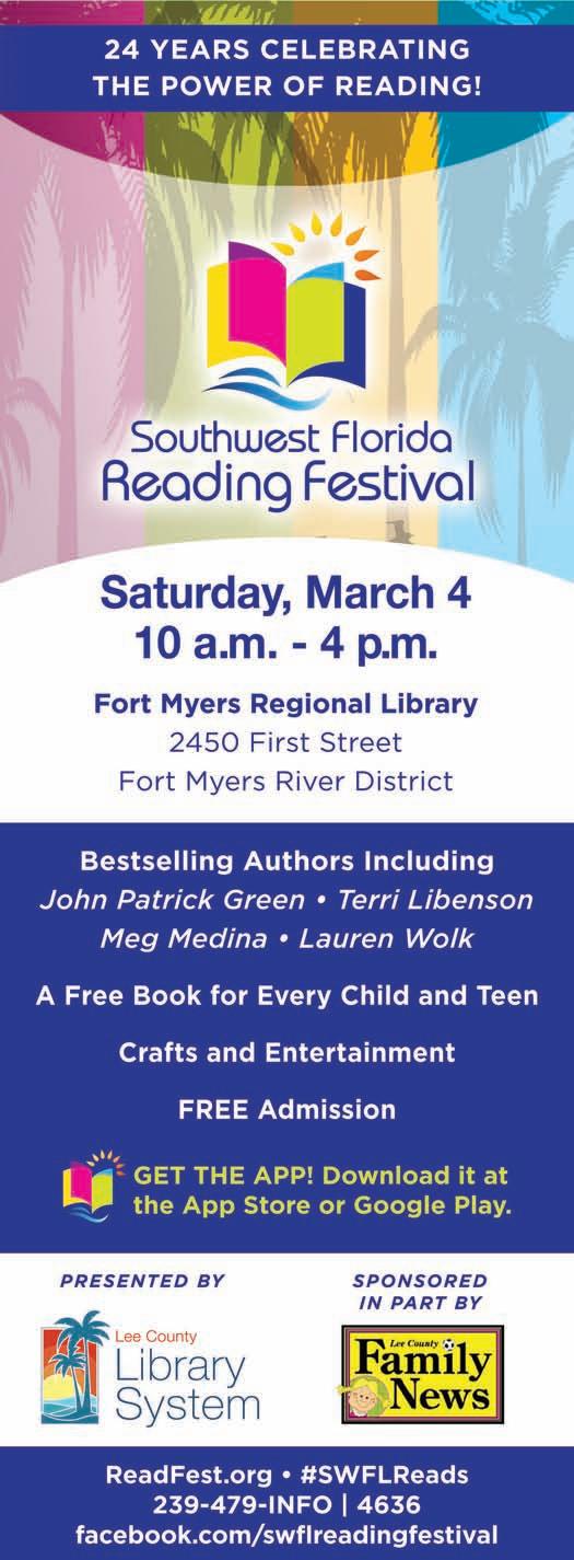 TheLeeCountyLibrary System’s24thannual SouthwestFloridaReadingFestivalwillhost25 authorsattheMarch event.Authorsforallages arecomingtoFortMyers tomeetfansandshowcasetheirbooksfrom10 a.m.to4p.m.Saturday, March4.Thefreeevent willbeheldontheoutdoorcampusoftheFort MyersRegionalLibrary locatedat2450FirstSt.