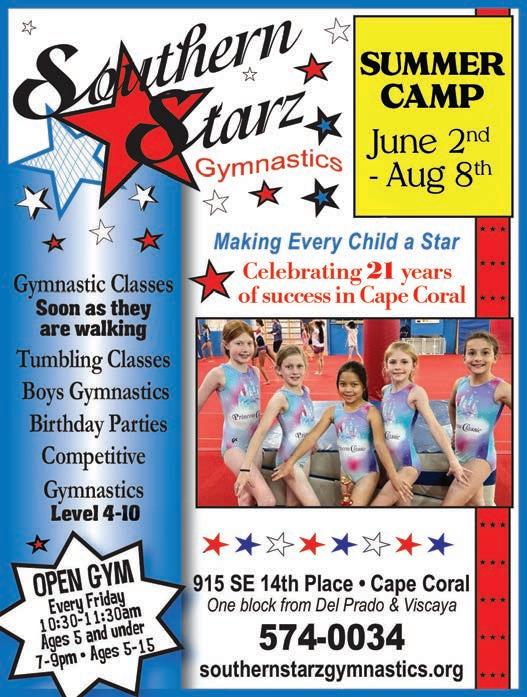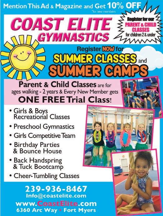 JoinusforSummerCampatCoastEliteGymnastics forages5–12.Ourcampisactionpackedwith gymnasticsclasses,artsandcrafts,thebounce house,movietime,andmuchmore!Regularhours are9a.m.-3p.m.Extendedhoursare7:30a.m.–6 p.m.Calloremailinfo@coastelite.comformoredetails.Registeronlinethroughourparentportal! 6360ArcWay,FortMyers 239-936-8467 CoastElite.com