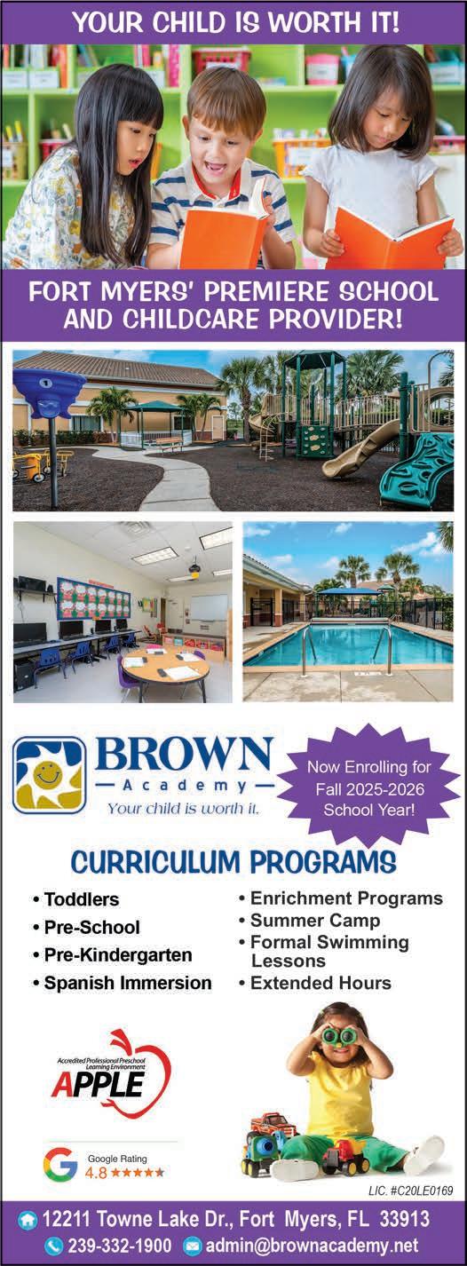 BrownAcademyoffersanewadventureeachandeverydayforchildrenages1to10!Excitingactivitiesincludeartsandcrafts,sing-alongs,sports,cookingactivitiesandpicnics.Eachweekyourchild willparticipateinanin-housefieldtripenjoyingspecialeventssuch aspuppetshows,magicshows,wildlifeexhibits,bouncehousesand ponyrides.Aspartofourcommitmentinkeepingyourchildsafe, everydaythechildrenwillhaveascheduledtimeinthepoolfor watersafetyinstruction.Forchildrenages11to15,weofferaspecialCounselorinTrainingProgram. 12211TowneLakeDr.,FortMyers 239-332-1900
