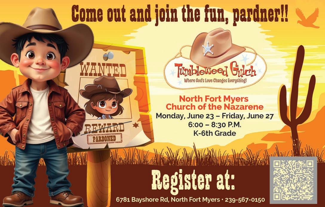 Tumbleweed Gulch – Where God’s Love Changes Everything Come out and join the fun, pardner Monday, June 23 through Friday, June 27 from 6 to 8:30 p.m. for kindergarten through sixth grade at North Fort Myers Church of the Nazarene 6781 Bayshore Road, North Fort Myers 239-567-0150