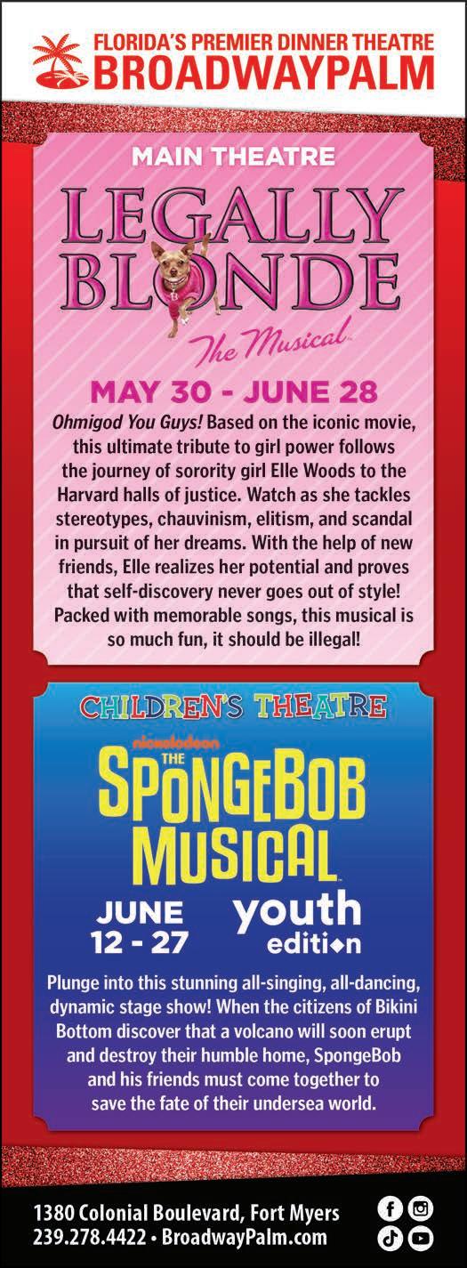 Unleashyourchild’screativityatArtsBonita’simmersiveSummer CampJune2–Aug.8.OfferingprogramsinVisualArts,Theatre,and Danceforkidsages4&up,camperswillexplorepainting,sculpture, acting,improv,musicaltheatre,andmore.Choosefromhalf-dayor full-dayoptions,withmorning,lunch,andaftercareavailable.Performingartsstudentscanshineinour3-weekSummerSpotlightprogram,culminatinginaliveshowcase.Scholarshipsavailable. 10150BonitaBeachRoad,BonitaSprings 239-495-8989