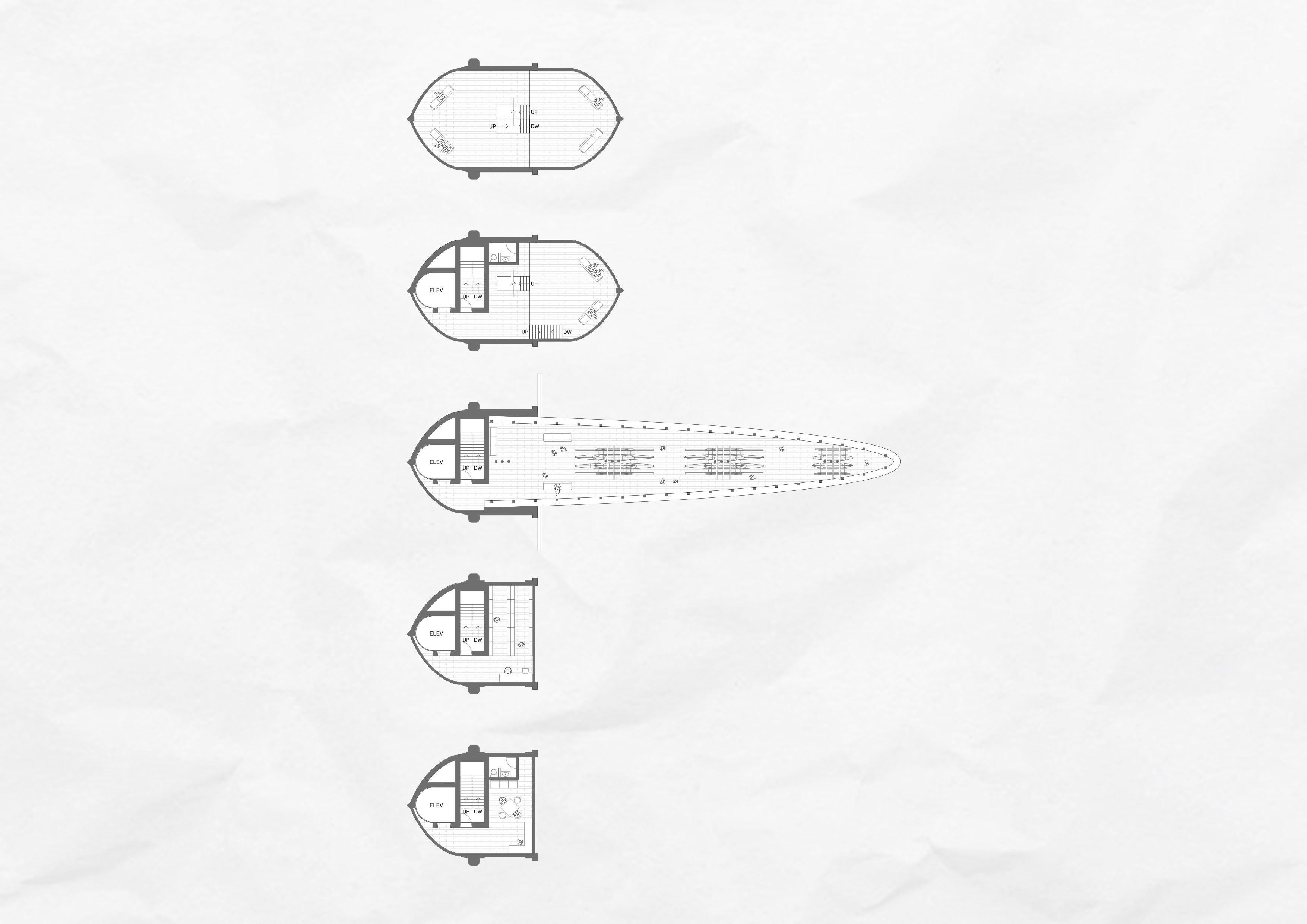 The main body of the Skyscraper takes form of a New- Zealand version of a canoe called the “Waka” (Māori War canoe) and along its back, different sizes of upside down canoe shaped structures are cantilevered out creating an image of a Waka carrying other Polynesian canoes. The cantilevered canoes points towards south for this was the way that Polynesian people found their ways to navigate and not to get lost by identifying the Southern Cross.