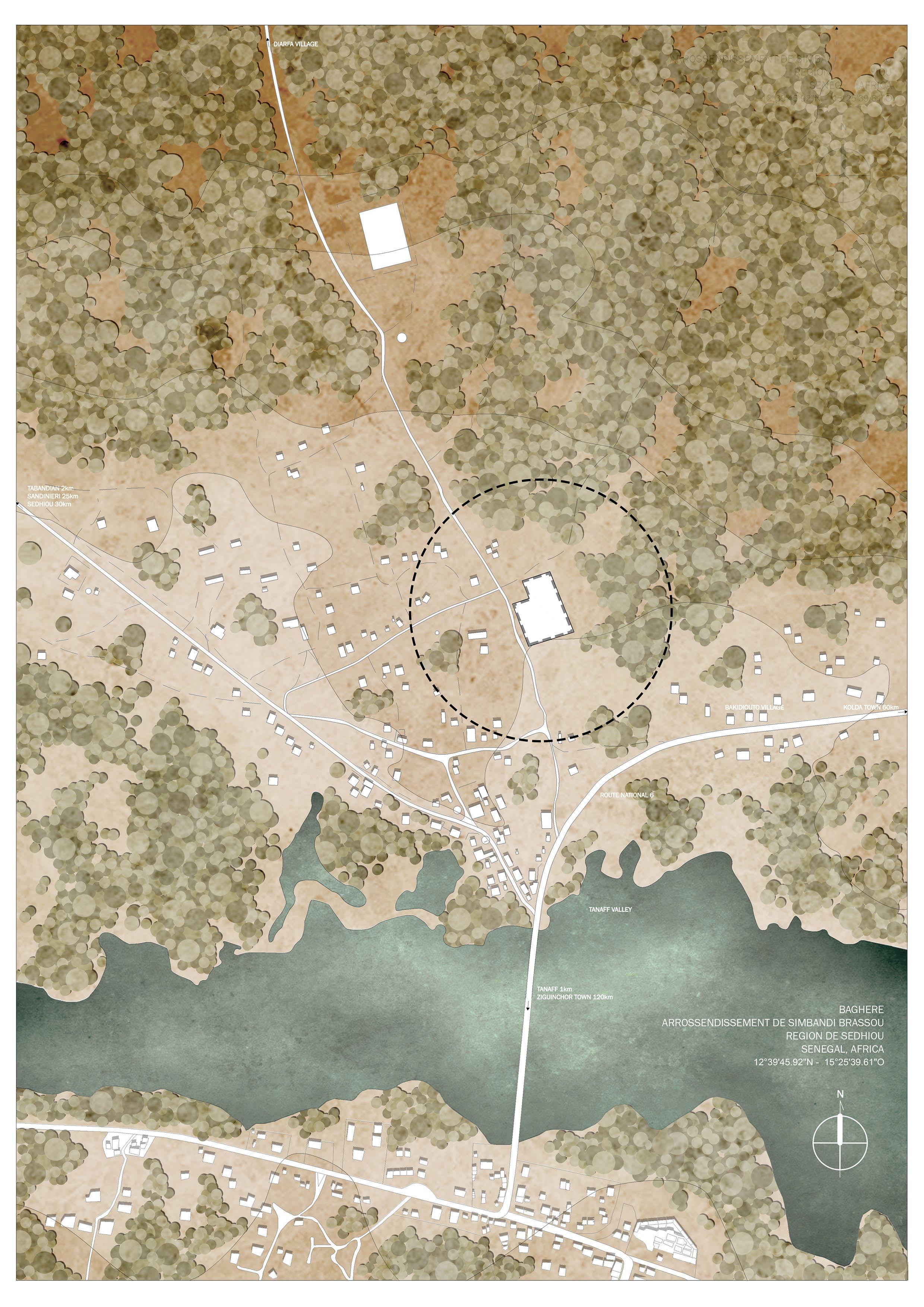 The site is an empty area in the village of Baghere, senegal. On the North and West side of the site, there are streets parallel to the sides of the site, joining at the north
