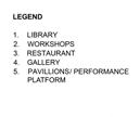 - Interactive architecture, where people, landscape, architecture interact with each other (amphitheaters, central courtyard, constant visual connection between different facilities)