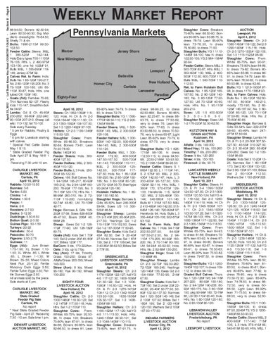 WEEKLY MARKET REPORT 88-94.50; Boners 82.50-94; Lean 80.50-90.50; Big Middle/lo dress/lights 76-84.50; Shelly 71 & dn. Bulls: 1990-2115# 99.50102.50. Feeder Cattle: Steers M&L 1 365-520# 142-144; Hols/Dairy types 700-11100# 76-105; Hfrs. L 2 490-975# 103-130; one hd 1025# 91; Bulls M&L 1 355-690# 118146; Jersey 275# 92. Calves Ret. to Farm: Hols. Bulls No. 1 85-120# 190-217; No. 2 80-120# 155-205; No. 3 75-100# 100-185; Util 65110# 30-87; Hols. Hfrs. one tubed OK 100# 180. Goats (/hd): Families 70-95; Thin Nannies 82-127; Fleshy Kids 110-147; Small/thin/bottle 34-97. Lambs: Gd & Ch 45-60# 230-262; 60-80# 222-240; 90-100# 207-210; Sheep (all wts) 110-132; fat 70-100. Sale every Tuesday * 5 pm for Rabbits, Poultry & Eggs * 6 pm for Livestock starting with calves. * Special Fed Cattle Sales May 1 & 15. * State Graded Feeder Pig Sale April 27 & May 18@ 1 pm. Receiving 7:30 until 10 am. CARLISLE LIVESTOCK MARKET, INC Carlisle, PA April 10, 2012 Rabbits: 10.50-15.50 Bunnies: 3-6 Turkin: 5.50 Chicks: 1-4 Pullets: 1.50-6 Peeps: 1 Hens: 2-8 Roosters: 2-7.50 Ducks: 5-12.50 Ducklings: 5.50-6.50 Button Quail: 2-3.50 Guinea Pigs: .50-1.50 Turkeys: 20-22 Hamsters: .50-4 Peacocks: 50-70 Pigeons: 2.50-2.75 Guineas: 11 Eggs (/dz): Jum Brown 1.75-1.90; XL Brown 1.101.50; XL White .85; L White .85; L Brown 1-1.30; M Brown .35-.55; Mixed Colors Nest Run .25-1.20; Fertile Muscovy Duck Eggs 5.50; Fertile Turkin Eggs 3.50; Fertile Guinea Eggs 2.50. All animals sold by the piece. Sale starts at 5 pm. CARLISLE LIVESTOCK MARKET, INC State Graded Feeder Pig Sale Carlisle, PA No report * Next State Graded Feeder Pig Sale - April 27. Receiving 7:30 - 10 am. Sale time 1 pm. DEWART LIVESTOCK AUCTION MARKET, INC