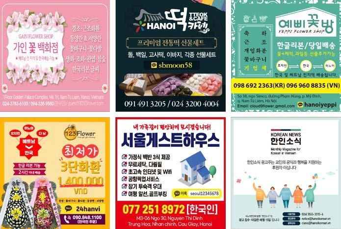 222 Korean News in Hanoi ESPRESS CONSULTANT REAL ESTATE TOU R/ HOTEL I T/ NETWORK SERVICE BEAUTY RESTAURANT CONSTRUCTION 광고문의 대표전화 024) 3555-3015~6 하노이한인회 발행“한인소식”의 광고 접수·마감은 매월 15일 입니다 notice3015@gmail.com 하노이 한인회는 한인사회를 대표하는 순수 민간단체로서 운영은 한인회 이사진들의 회비와 한인소식지의 광고비로만 운영됩니다. 간혹, 정부 보조금을 받는 것으로 잘못 알고 있는 분도 계시는데 절대로 그렇지 않습니다. 또한 한인소식의 광고비로써 모든 한인회의 활동이 이뤄지기에 한인소식 광고주를 한인사회를 위해 후원하시는 후원자라고 부릅니다.