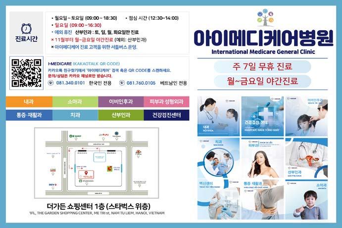 치과(Dr.권재신) 한의과(Dr.윤명범) 산부인과, 비뇨기과, 일반외과, 가정의학과 등은 베트남 의사가 진료 월~토 AM9~PM6 일 AM9~PM4