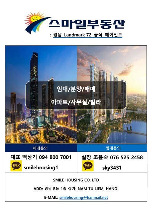 하노이 한인소식 221 ESPRESS CONSULTANT REAL ESTATE TOU R/ HOTEL I T/ NETWORK SERVICE BEAUTY RESTAURANT CONSTRUCTION 전화 083 665 3544 / 인터넷폰 070 8623 4745 hoaipark hanoibest 본사 : 하노이 빈홈 스카이레이크 아파트 S3동 1층 11호 ( 호수 공원 방향 위치) 분양문 의 전화 097 328 7566 / 098 558 4331 bestbds / bestbds1 임대문 의