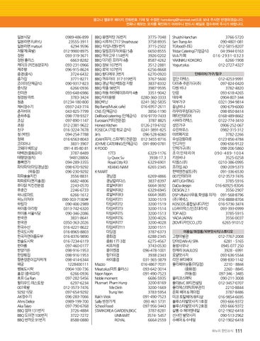 Shuishi Hanchan 3766-5720 Sen Trang An 090-4801-081 TGfood(나또) 012-5815-8207 Tristar Catering(기업급식) 04-3944-0163 WA카페 016-2931-0323 YAKINIKU KOKORO 6266-1908 Yogurt plus 012-2727-4327 인테리어/가구/침구