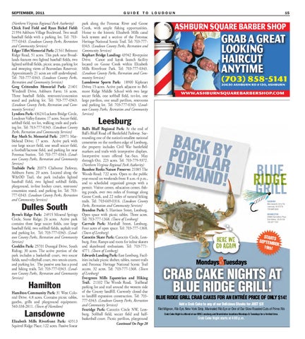 Ball’s Bluff Regional Park: At the end of Ball’s Bluff Road off Battlefield Parkway. Surrounding one of the nation’s smallest national cemeteries on the northern edge of Leesburg, the property includes Civil War battlefield markers and trails with interpretive displays. Interpretive tours offered Sat.-Sun. May through Oct. 223 acres. Tel: 703-779-9372. (Northern Virginia Regional Park Authority) Banshee Reeks Nature Preserve: 21085 The Woods Road; 722 acres. Open to the public year-round on weekends from 8 a.m.-4 p.m., and to scheduled organized groups with a permit. Visitor center, education center, fishing ponds, over two miles of frontage along Goose Creek, and 22 miles of natural hiking trails. Tel: 703-669-0316. (Loudoun County Parks, Recreation and Community Services) Brandon Park: S. Harrison Street, Leesburg. Open space with picnic tables. Three acres. Tel: 703-777-1368. (Town of Leesburg) Carrvale Park: Marshall Street, Leesburg. Four acres of open space. Tel: 703-777-1368. (Town of Leesburg) Catoctin Skate Park: Catoctin Circle, Leesburg. Free. Ramps and room for inline skaters and skateboard enthusiasts. Tel: 703-7714771. (Town of Leesburg) Edwards Landing Park: East Leesburg. Facilities include picnic shelter, tables, nature trails and Potomac Heritage National Scenic Trail access. 32 acres. Tel: 703-777-1368. (Town of Leesburg) Evergreen Mills Equestrian and Hiking Trail. 21332 The Woods Road. Trailhead parking lot and trail around the western side of the County landfill. Currently closed due to landfill expansion construction. Tel: 703777-0343. (Loudoun County Parks, Recreation and Community Services) Foxridge Park: Catoctin Circle NW, Leesburg. Softball field, soccer field and halfbasketball court. Picnic pavilion, playground Continued On Page 28