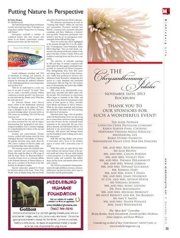 selected by Prosek from the NSLM collection. The afternoon presentations focused on “Teaming with Nature” within our own lives and communities. Presenters included Lisa Roberts, a museum and community education consultant, and Perry Mathewes, a horticultural specialist. Symposium participants were invited to view the art of contemporary artistnaturalists Robin Hill and Meg Page. Those two artists also will be highlighted at the museum through Feb. 23 in the exhibition “Contemporary Artist-Naturalists: Robin Hill & Meg Page.” They are both deeply connected to the natural world and continue in the spirit of the likes of Dürer, Catesby, Wilson and Audubon rendering fauna and flora from near and far. The selection of naturalist paintings by Hill and Page of animals composed with native plant-life often against minimalist backgrounds are masterful and distinct interpretations distinguishing them from their peers and raising them to the level of their forerunners. Unlike their predecessors, however, who oftentimes found themselves cataloguing new species in a lush, abundant and untouched environment, Hill and Page face the modern issue of documenting and preserving wildlife in a diminishing habitat. Hill’s career as an internationally recognized artist, naturalist and author spans over five decades. His involvement in conservation efforts began in Australia in the 1960s, and since then he has observed and painted a wide variety of avian species in Africa, Australia, Great Britain and Europe as well as America. While he also paints mammals and portraits, this exhibition will feature the bird paintings for which he is best known. Maryland-native Page, a fine art graduate of the Cleveland Institute of Art, too, has strong ties to conservation, and in her career spanning more than 30 years, she has continually found inspiration in the countryside. She says of her diverse domestic and wild animal subjects, “Art dedicated to the preservation of the natural landscape, wild species and heritage breeds was the foundation of my working career and a life-long passion.” Both Hill and Page display acute powers of observation and a focus on the aesthetic aspects of nature with a meticulous sense of detail. While their styles are quite diverse, their work celebrates the intrinsic beauty of the natural world and echoes the past while lending a fresh perspective. It is this painterly balance between reality and sensitivity that defines them, and the classic and timeless efforts of the artist-naturist. The NSLM is committed to sharing information through exhibitions, lectures, seminars, publications and special events, and is open to researchers and the general public.